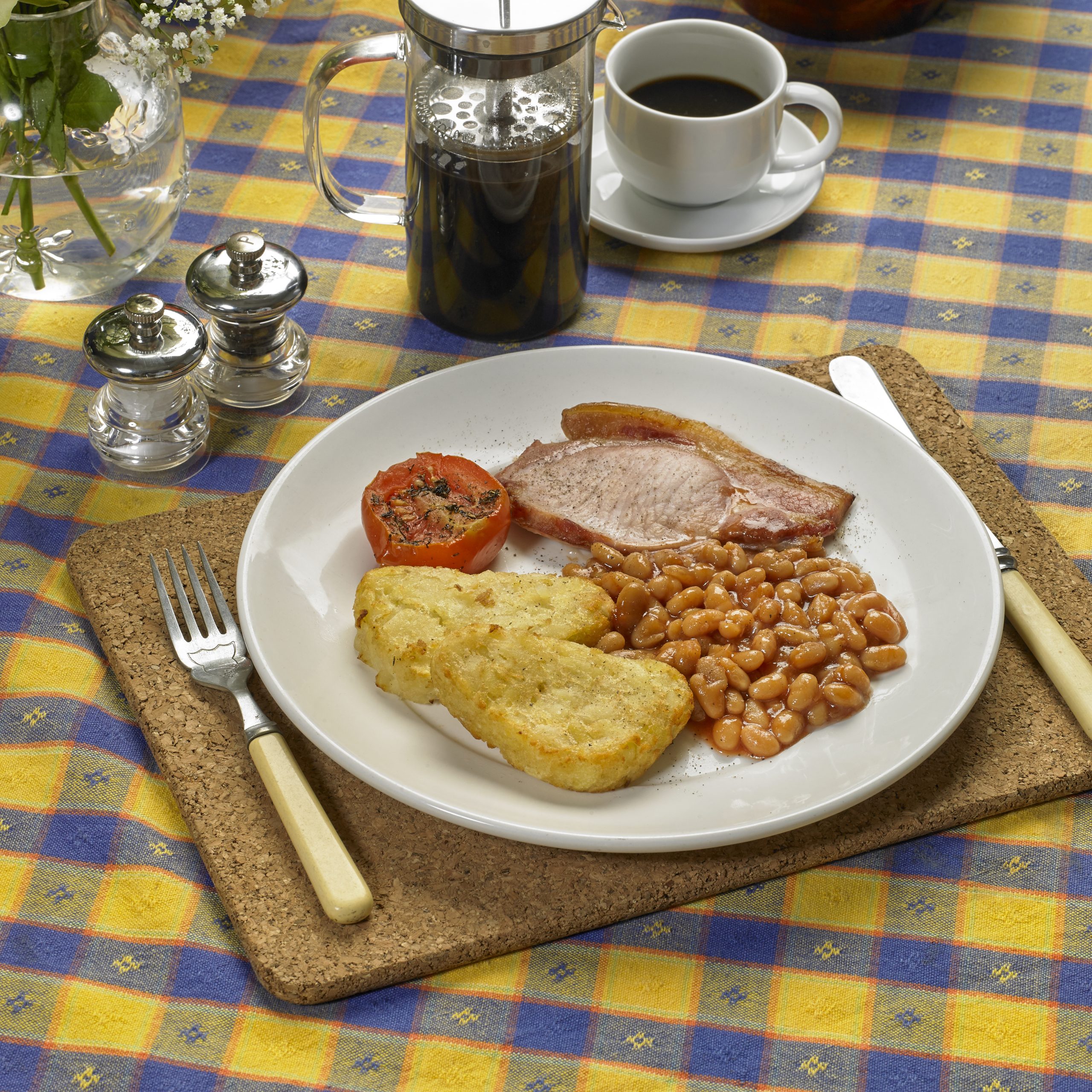 Free range locally sourced bacon chop, served with hash browns, baked beans and thyme roasted tomato.